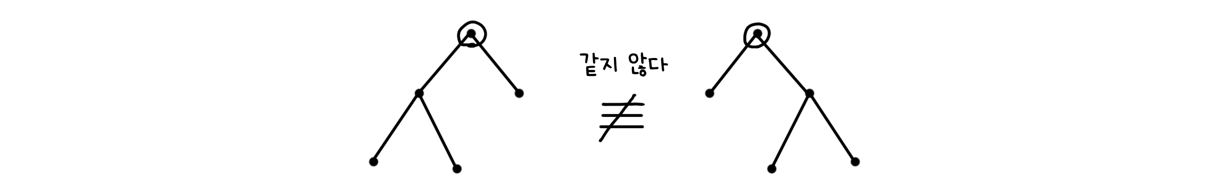 이어서 이진 트리는 루트 트리에 더해 자식이 둘 까지 존재할 수 있다는 조건이 추가됩니다. 때문에 이진 트리의 동형 사상은 왼쪽 자식과 오른쪽 자식의 위치가 그대로 보존되어야 한다는 조건이 더해집니다.