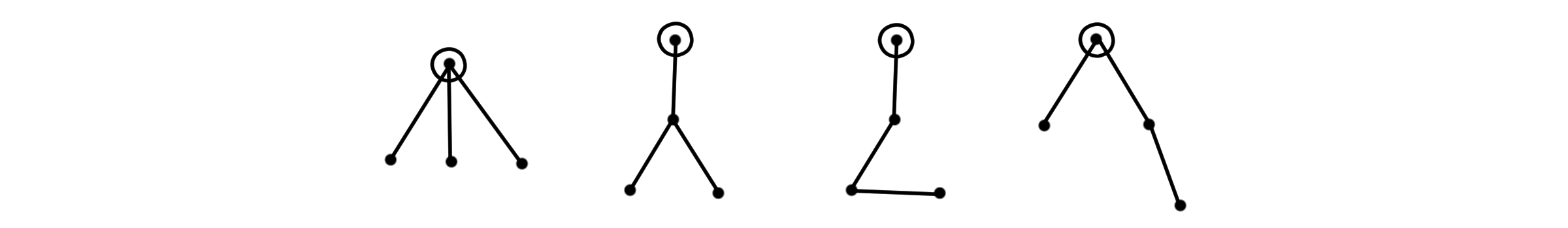점의 개수가 4개인 루트 트리는 4개의 서로 다른 비동형 트리를 가진다.
