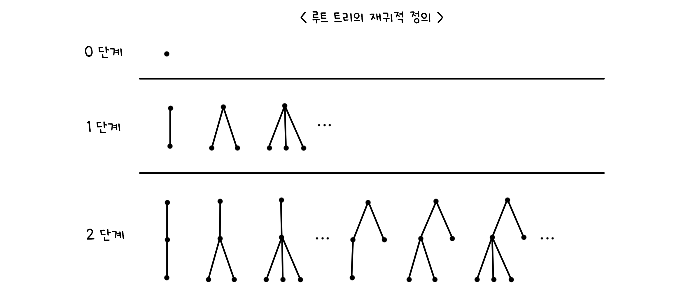 | 루트 트리 | 점 $r$ | 트리 $T_i \; (i=1, 2, …, n)$와 새로운 점 $r$에 대해 $(r, r_i) \in T$인 트리 $T$ |