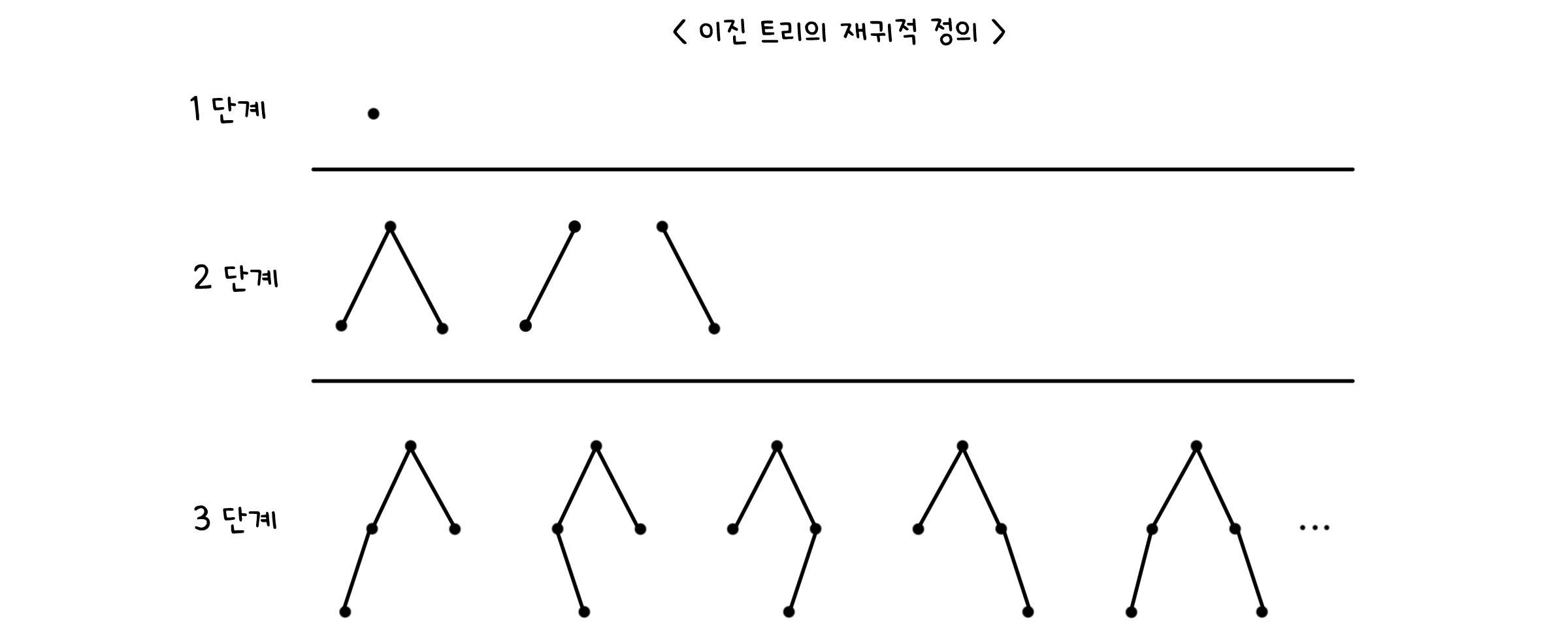 | 이진 트리 | 빈 트리 $\emptyset$ | 이진 트리 $T_i \; (i=1, 2)$와 새로운 점 $r$에 대해 $(r, r_i) \in T$인 트리 $T$ |