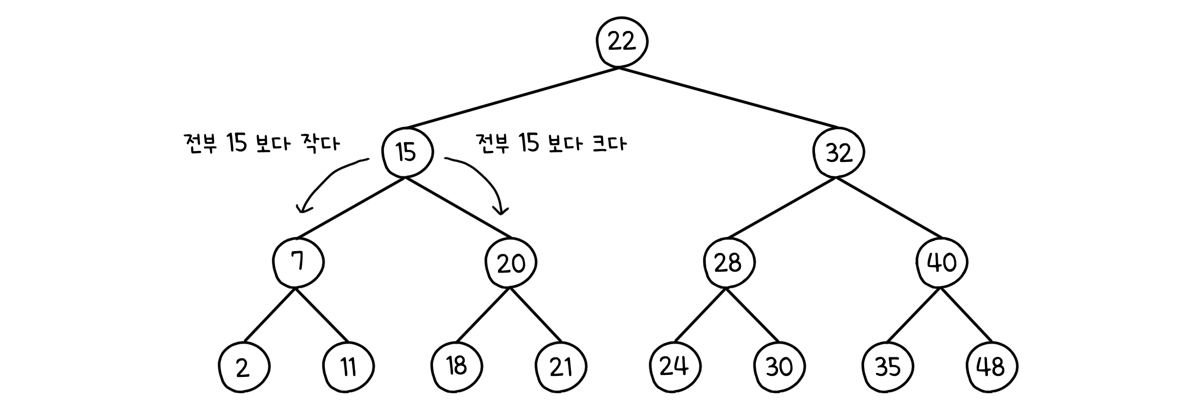 이진 탐색 트리의 각 노드는 그 값의 대소관계에 따라 정렬되어 있습니다. 어떤 노드의 값을 $e$라고 했을 때, 그 노드의 왼쪽 하위 트리는 모두 $e$보다 작은 값을 가지고, 오른쪽 하위 트리는 모두 $e$보다 큰 값을 가지게 되는 식입니다.