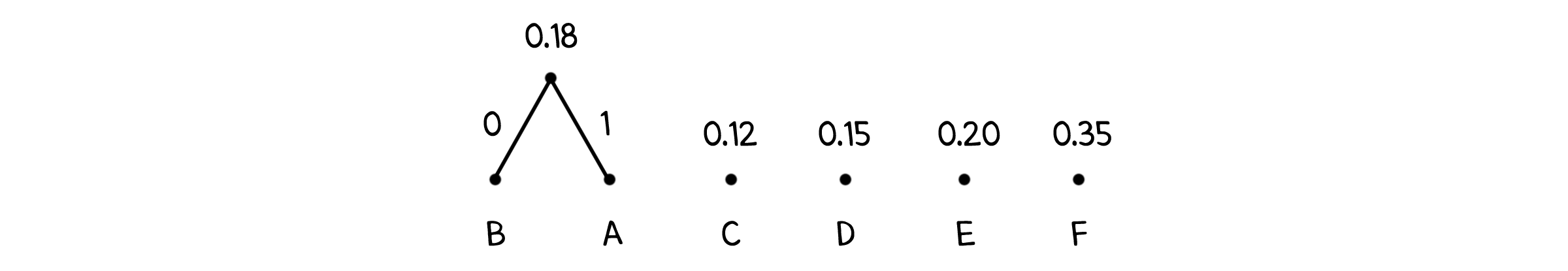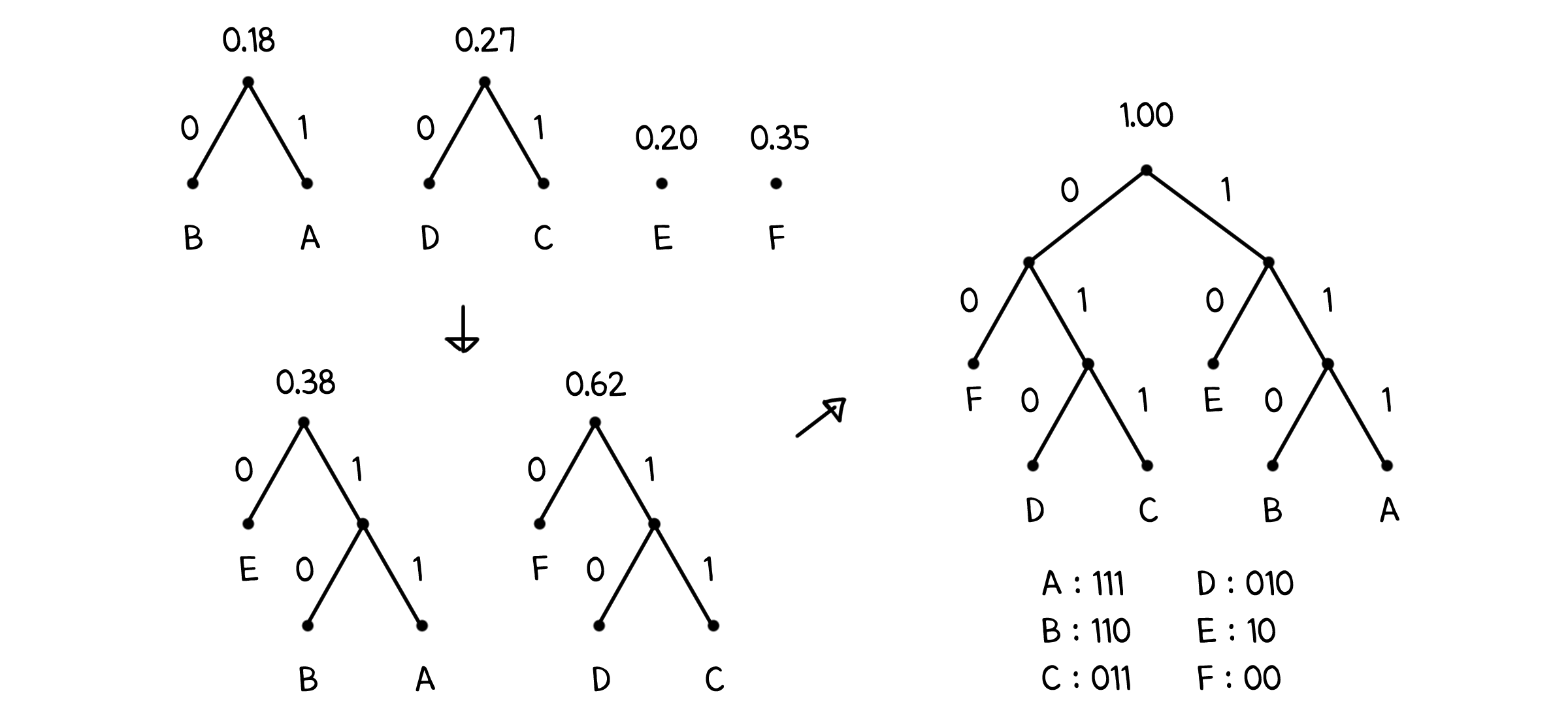 연결된 이진 트리가 완성되었다면, 이제 루트에서 각 노드로 내려오면서 숫자를 부여할 수 있습니다. 높이 2인 E(10)와 F(00)는 두 자리, 높이 3인 A(111), B(110), C(011)는 세 자리의 비트를 가지게 됩니다. 이 방법은 노드들이 (이 경우에는)내림차순대로 정렬된다는 장점도 있지만, 더 중요한 것은 사용하는 비트가 최소가 되도록 설정할 수 있다는 것입니다. 자주 사용되는 노드의 비트는 작게 부여함으로서 평균적으로 사용되는 비트의 수를 최소화하게 됩니다. 만약 가중치가 출현 빈도를 뜻한다면, 이 예시에서 우리가 평균적으로 사용하게 될 비트 수는