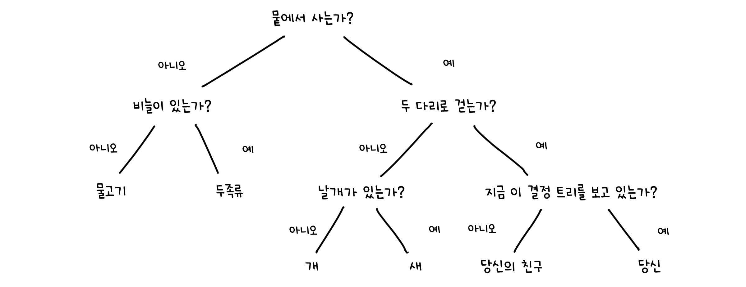 의사 결정 트리(Decision tree)에서 하나의 노드는 하나의 질문을 던집니다. 예/아니오로 대답할 수 있는 질문일 수도 있고, 여러 답이 나오는 다지선다일 수도 있습니다. 어쨌거나 각각의 대답은 하나의 선으로 이어지고, 선은 또 다른 질문으로 이어지게 됩니다. 계속되는 문답 끝에 잎 노드는 적절한 답을 내놓게 됩니다.