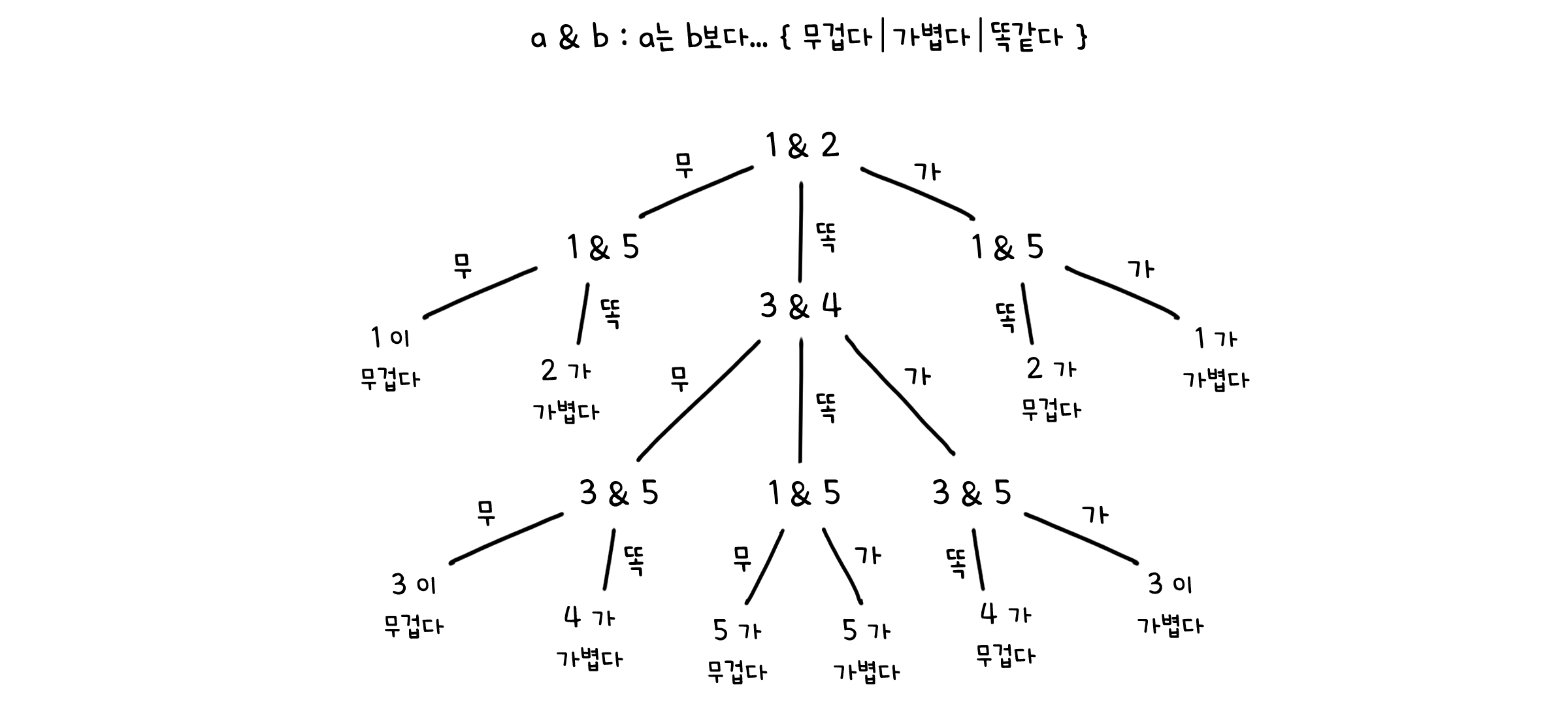 다섯 개의 동전에 1 부터 5까지의 번호를 부여합니다. 그리고 두 동전을 비교하여 어느쪽이 무거운 지 비교하는 과정을 하나의 노드로 나타냅니다. 가능한 답은 무겁다/가볍다/똑같다 세 가지가 될 수 있으니, 하나의 노드는 최대 세 개의 선을 가질 수 있습니다. 그 선으로 이어지는 자식들은 또 다른 두 동전을 비교하게 되겠죠? 그렇게 가능한 경우의 수를 좁히다보면 다른 동전과 무게가 다른 가짜 동전을 특정할 수 있게 될 것입니다.