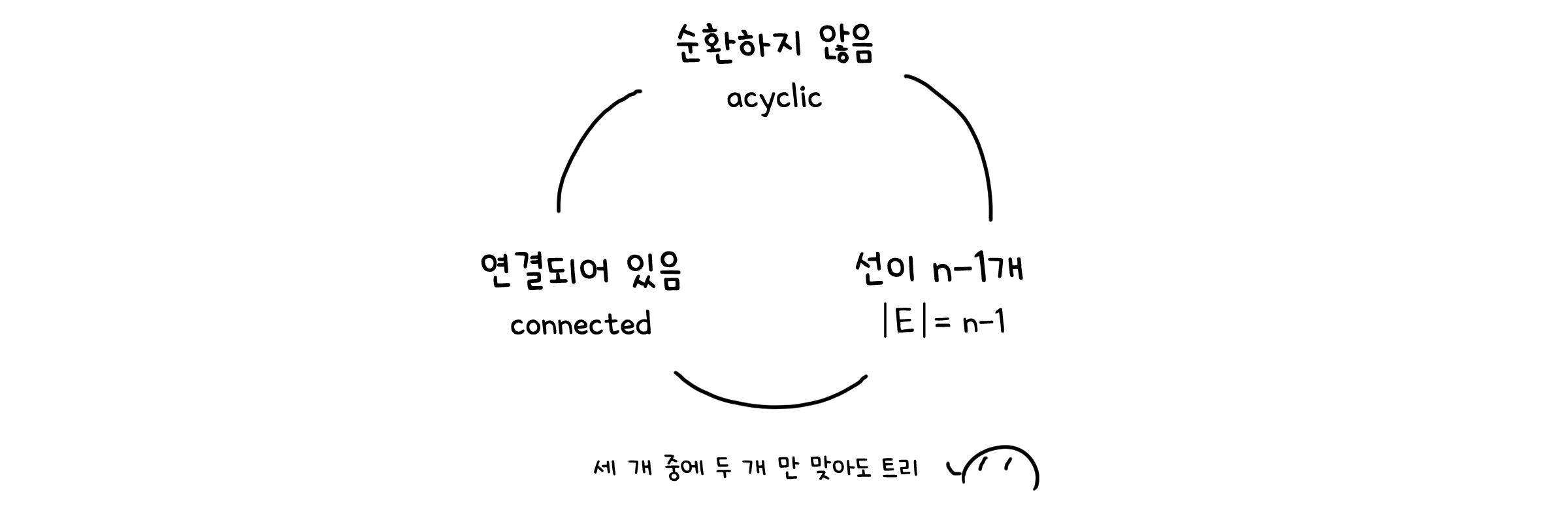 - $T$는 순환하지 않고(acyclic), 총 $n-1$개의 선을 가진다.