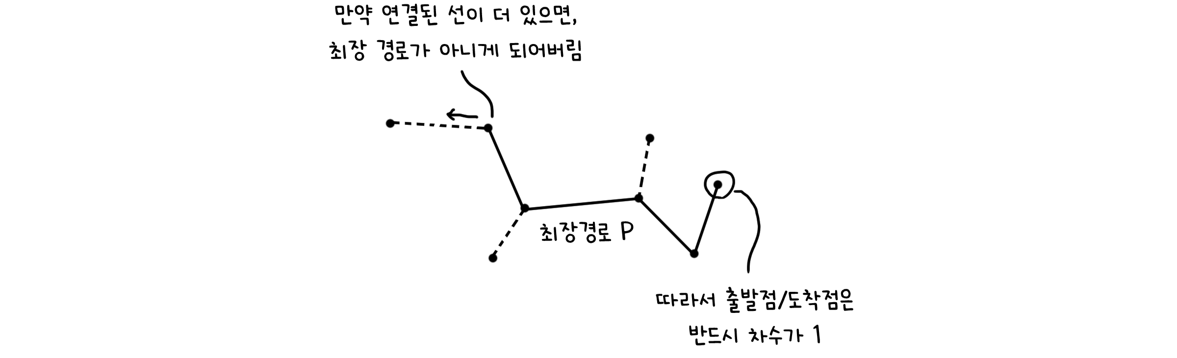 $T$는 순환하지 않으니까, $P$는 회로가 될 수 없습니다. 때문에 $P$의 시작점이나 도착점은 그 차수가 1일 수 밖에 없어요. 만약 1보다 더 크다면 더 이어진 선이 있다는 뜻이고, 그렇게 된다면 $P$는 가장 긴 경로가 아니게 되니까요.