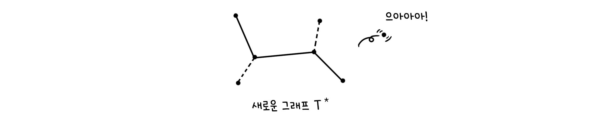 (무엇이 되었든)시작점 또는 도착점 중 하나를 $v$라고 합시다. 이제 $T$에서 이 점을 빼 볼거에요($v$와 연결된 선도 빠지겠죠). $v$가 빠진 새로운 그래프를 $T^*$라고 할게요. 우선 $T^*$가 트리를 만족하는지 살펴봅시다. $v$는 차수가 1이므로, 어떠한 두 점도 $v$를 통해 연결되어 있지 않습니다. 따라서 원래 연결되어 있고 순환하지 않던 $T$는 $v$ 하나가 빠졌다고 해서 연결이 끊어지거나 순환 회로가 생겨나지 않을 것입니다. 따라서 $T^*$도 똑같이 트리라고 볼 수 있겠죠.