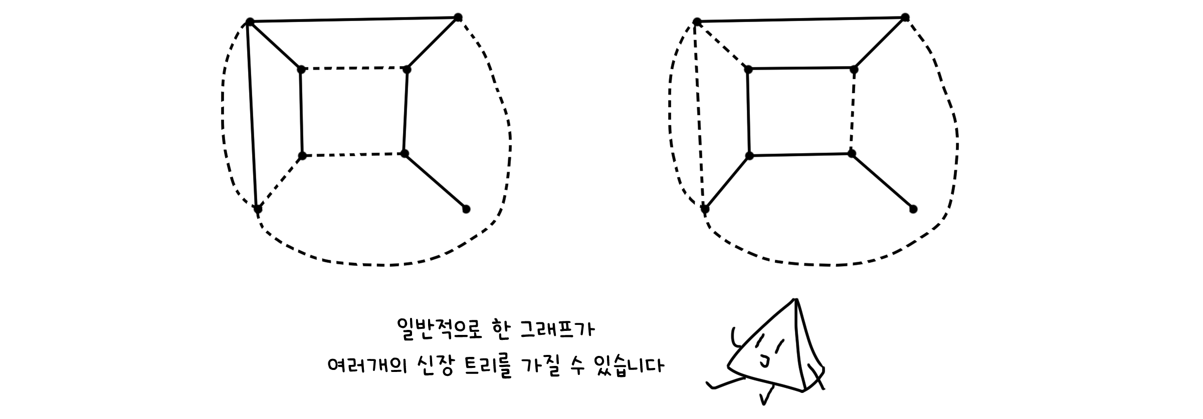 어떤 그래프 $G$에 대해서 모든 점을 포함하는 하위 트리가 있을 때, 그 트리를 신장 트리(Spanning tree)라고 부릅니다. 신장 트리가 존재한다면 그 그래프는 연결되어 있다고 볼 수 있으며, 그 반대도 성립합니다.