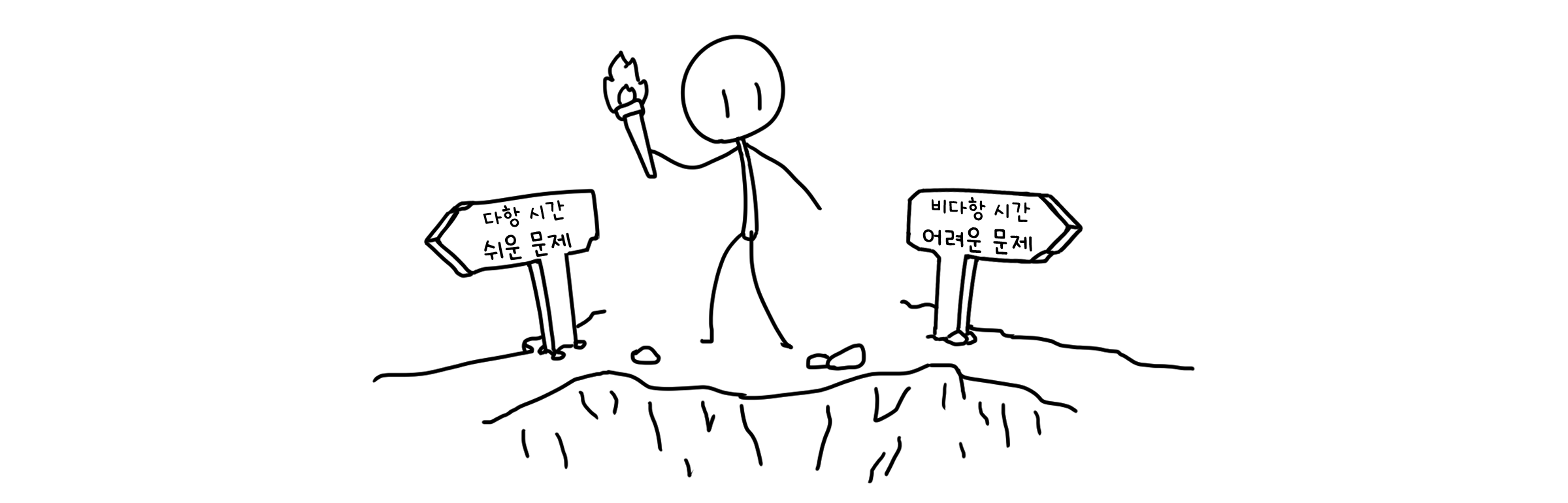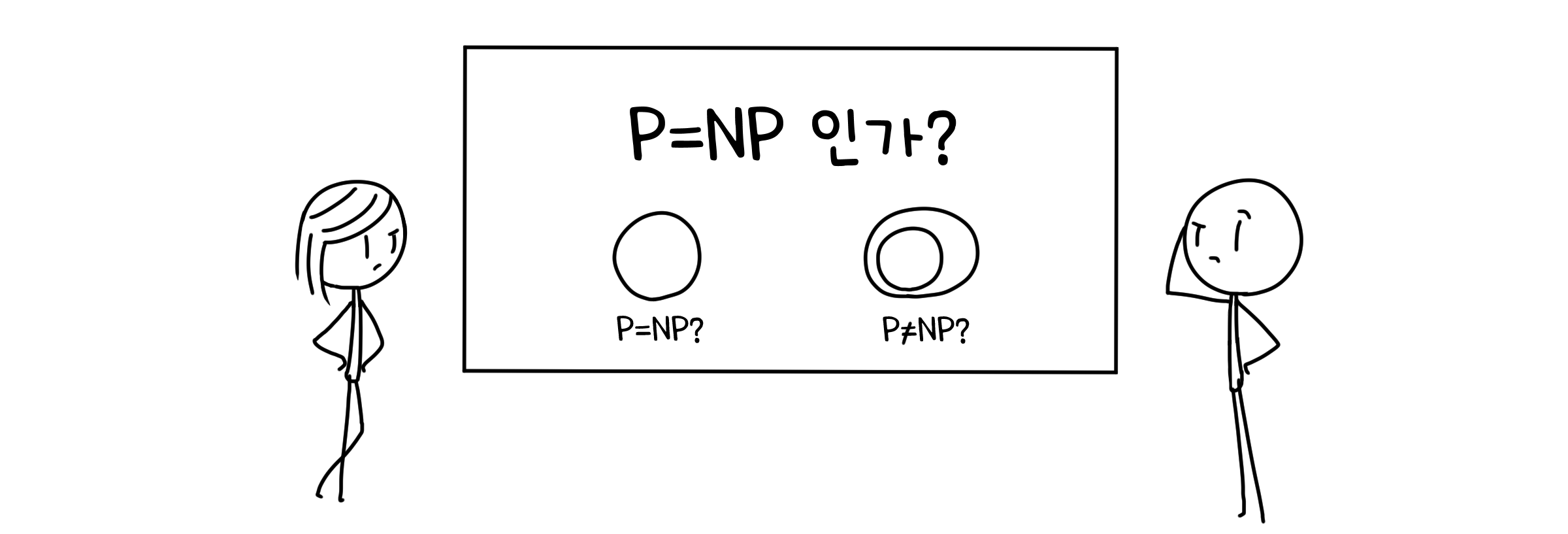 이렇게 우리는 문제를 푸는 데 걸리는 시간을 기준으로 문제가 어려운지 쉬운지를 판단할 수 있습니다. 다항 시간 안에 풀 수 있는 문제를 ‘쉬운 문제’로, 그렇지 않은 문제를 ‘어려운 문제’로 정해두는 식이죠.