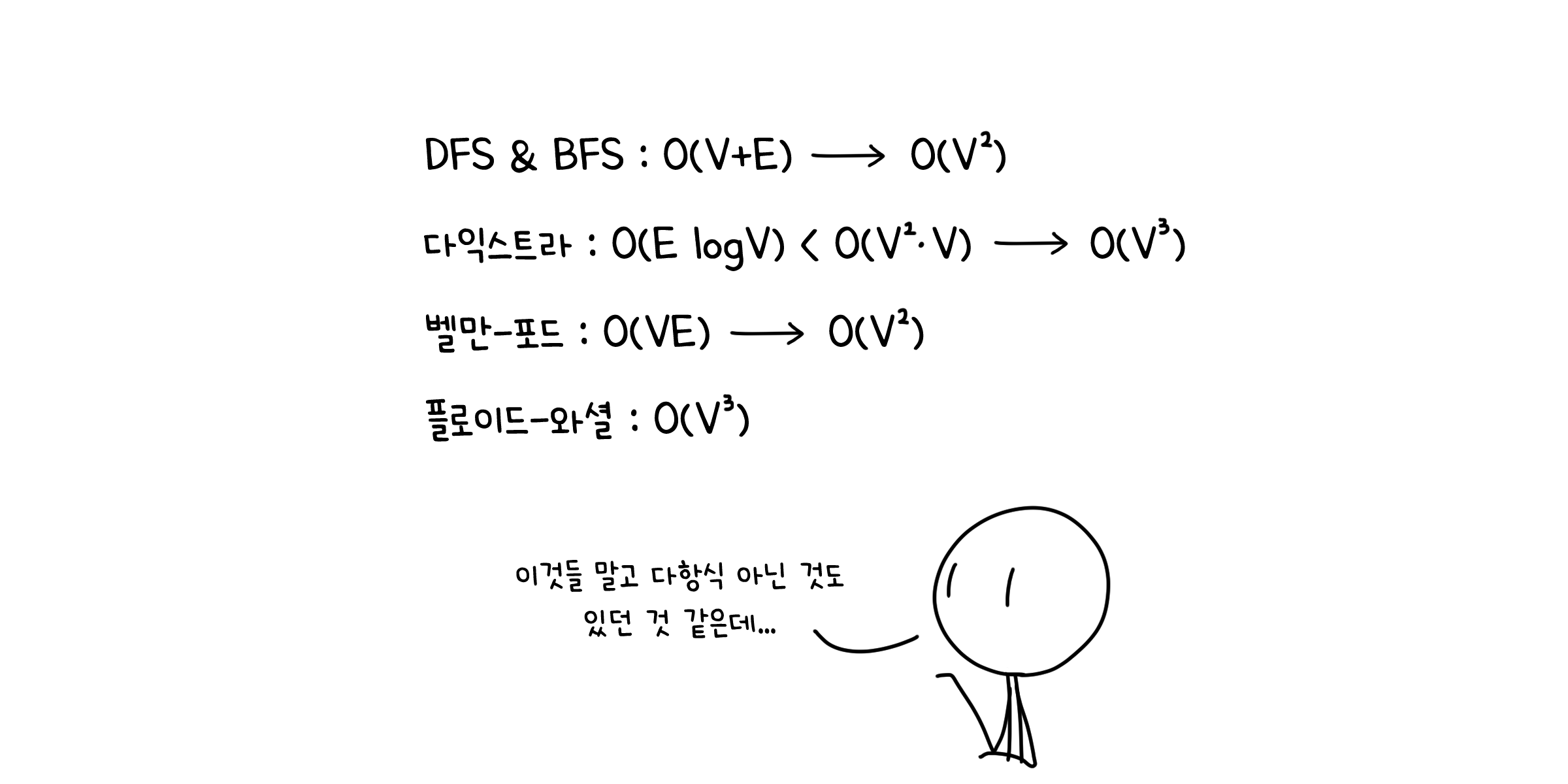 이때까지 우리가 살펴본 알고리즘들의 실행 시간을 되짚어봅시다. 너비 우선 탐색과 깊이 우선 탐색은 $O(V+E)$ 시간에 수행되며, 최단 경로를 찾는 다익스트라 알고리즘은 $O(E\log{V})$, 벨만-포드 알고리즘은 $O(VE)$시간 안에 최단 경로를 찾을 수 있었습니다.