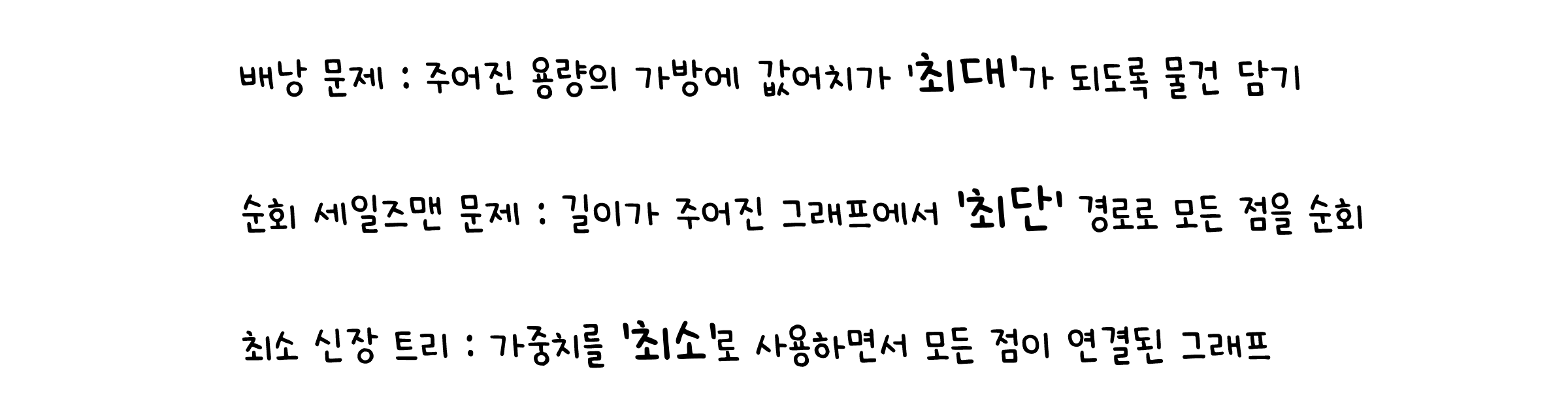 본격적으로 들어가기에 앞서, 한 가지 정리가 더 필요합니다. 생각해보면, 이때까지 우리가 해결했던 문제들은 대부분 ‘가장 짧은 길이’, ‘가장 높은 값’과 같이 주어진 조건에서 최대, 혹은 최솟값을 구하는 이른바 최적화 문제였습니다.