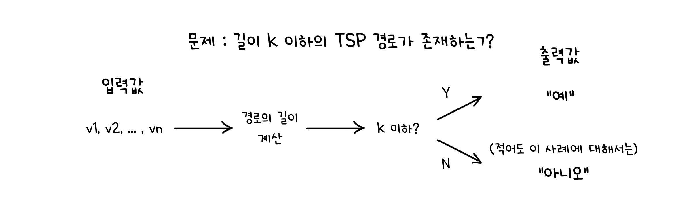 예를 들어 순회 세일즈맨 문제(TSP)는 ‘모든 지점을 방문하는 최단 경로의 길이는 얼마인가?’라는 최적화 문제였죠. 이는 ‘모든 지점을 방문하는 길이가 k 이하인 경로가 존재하는가?’라는 결정 문제로 바꿀 수 있습니다. 여기서 입력값은 경로가 되고, 그에 따른 결과값은 ‘예’와 ‘아니오’ 둘 중 하나로만 나오게 됩니다.