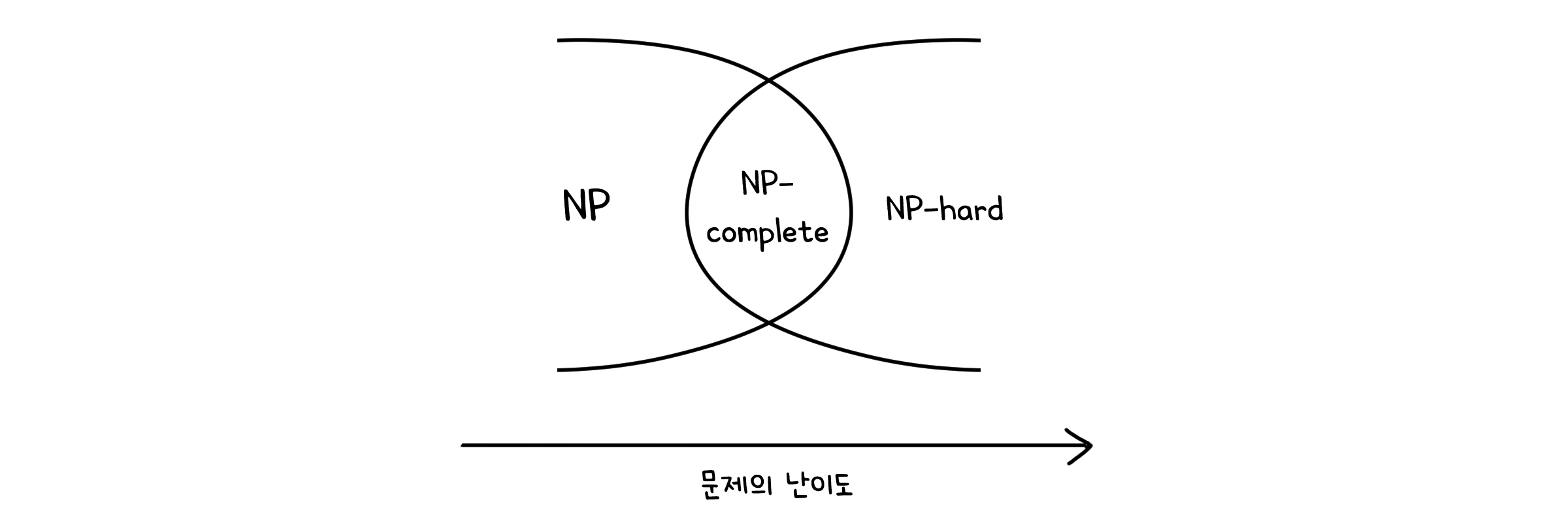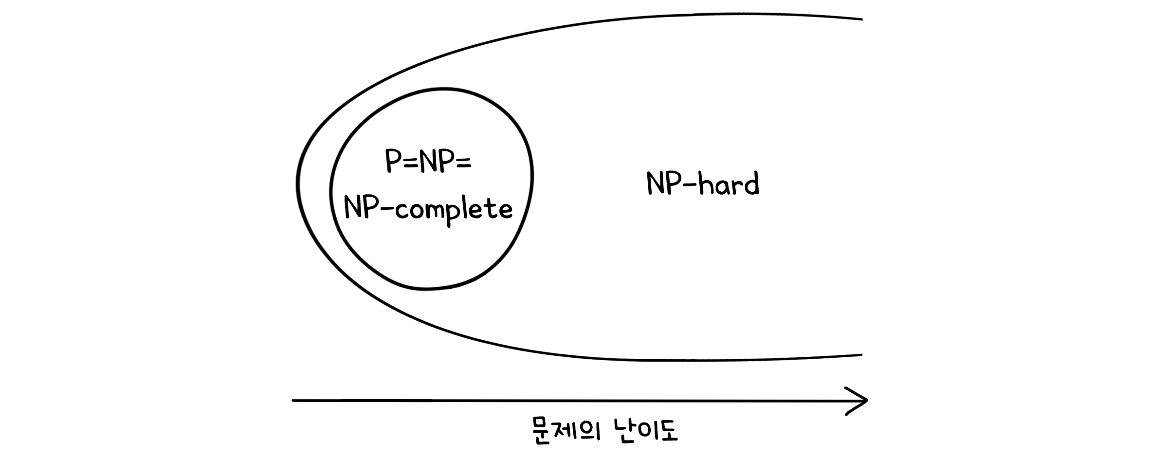 이때까지 살펴본 문제들의 범위를 정리해보면, 다음과 같이 나타낼 수 있습니다. NP-hard와 NP는 NP-complete라는 교집합을 가지며, NP는 P를 포함하고 있는 형태죠.