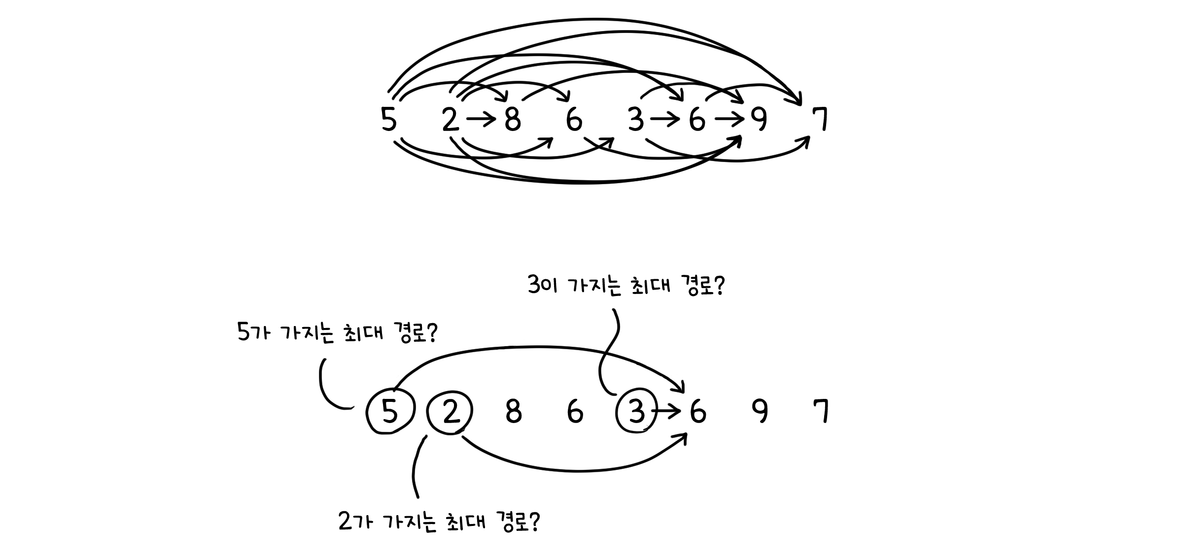우리는 이 수열을 방향이 있는 비대칭 그래프(DAG)로 나타내어 DAG 경로 중 가장 긴 길이를 구하는 문제로 바꾸어 풀었었죠.