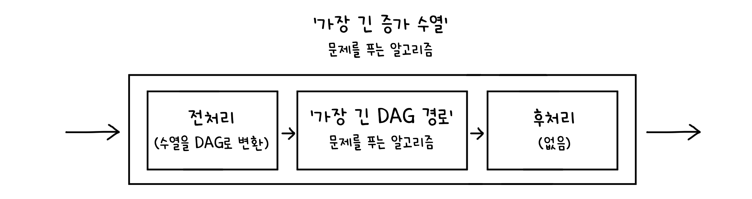 ‘가장 긴 증가 수열’과 ‘가장 긴 DAG 경로’는 엄연히 다른 문제지만, 우리가 수열을 DAG로 변환하는 과정을 거침으로서 동일한 문제가 된 셈입니다. 이렇게 문제를 약간 손 봄으로서 다른 문제로 바꾸는 것을 환원(Reduction)이라고 부릅니다. 위 예시에서는 ‘가장 긴 증가 수열’ 문제가 ‘가장 긴 DAG 경로’ 문제로 환원되었다고 말할 수 있습니다.