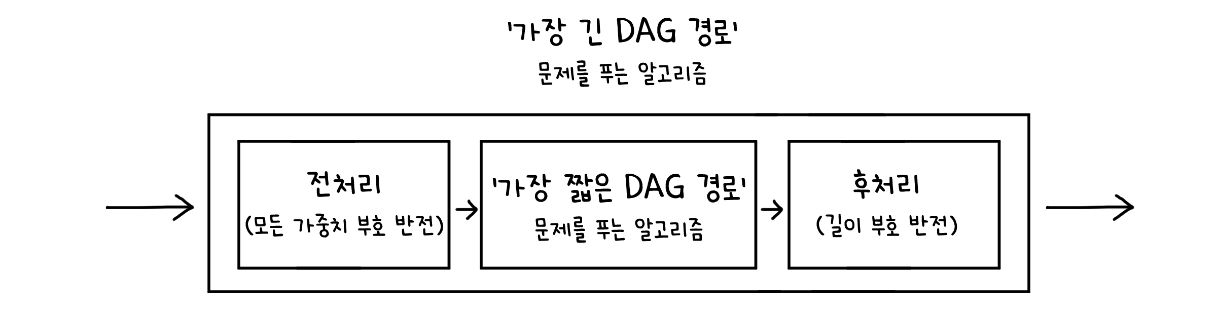 간단한 예시를 하나 더 들어볼까요? ‘가장 긴 DAG 경로’ 문제는 ‘가장 짧은 DAG 경로’ 문제로도 환원할 수 있습니다. 그래프의 모든 가중치 부호를 반대로 역전하면 되니까요.