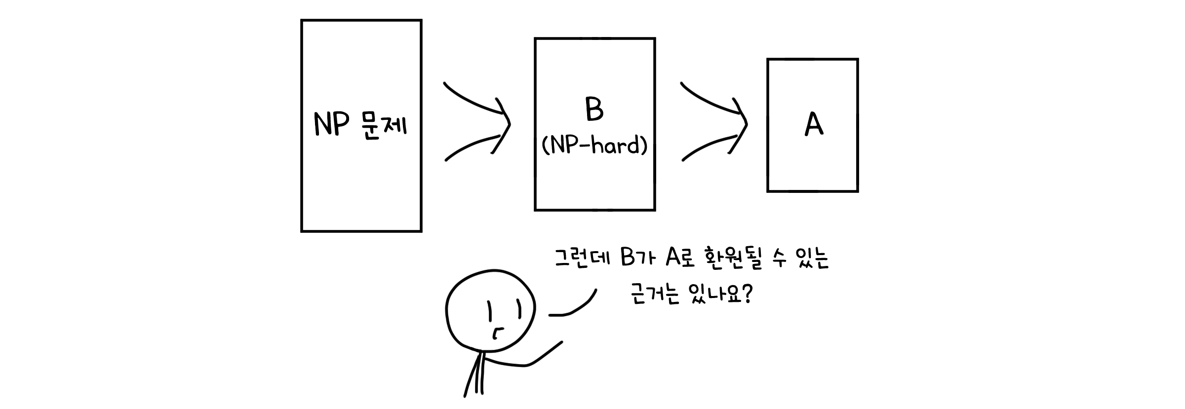 어떤 문제 A가 NP-hard임을 보이고 싶다면, 다른 NP-hard 문제 B를 가져와 증명할 수 있습니다.