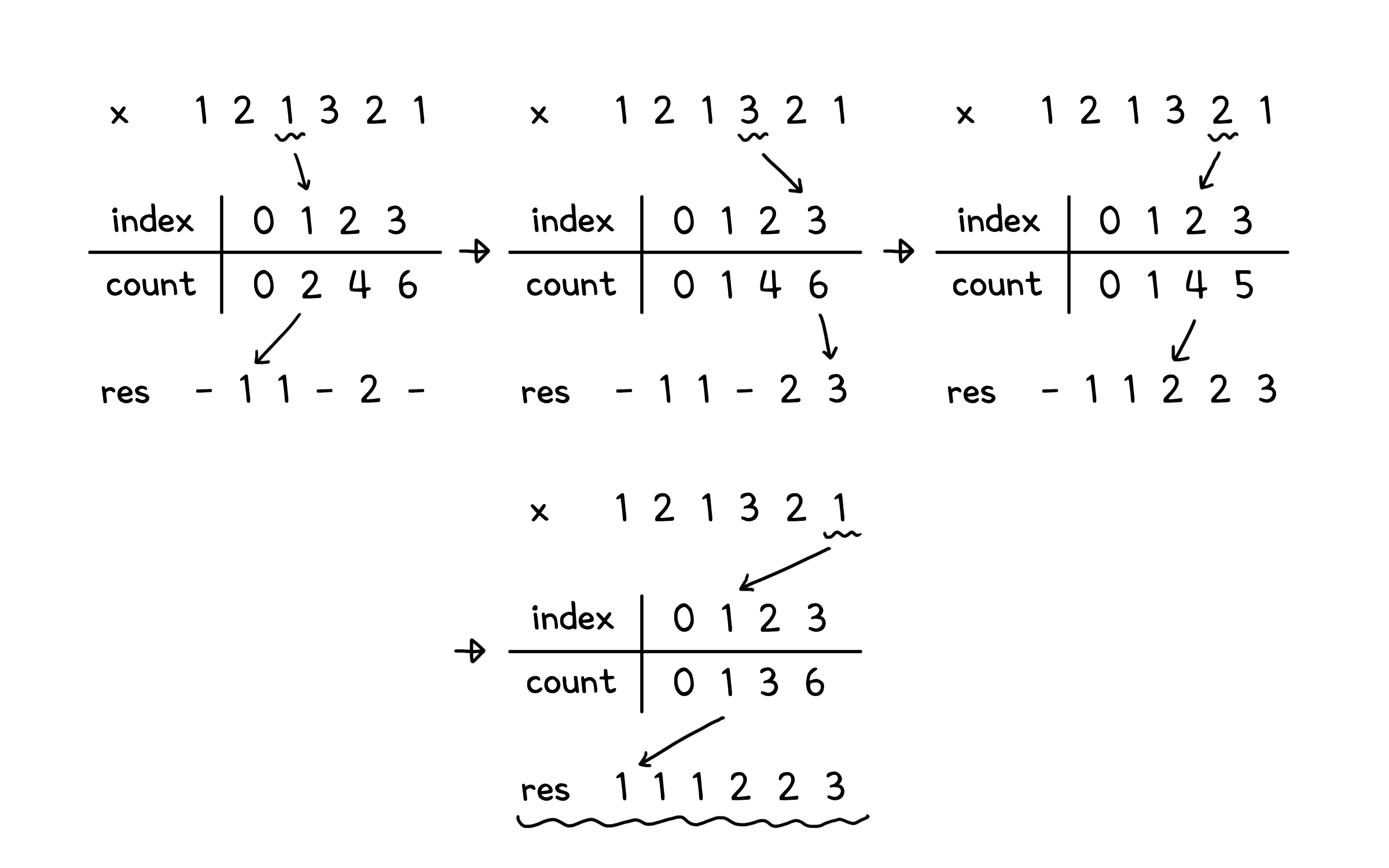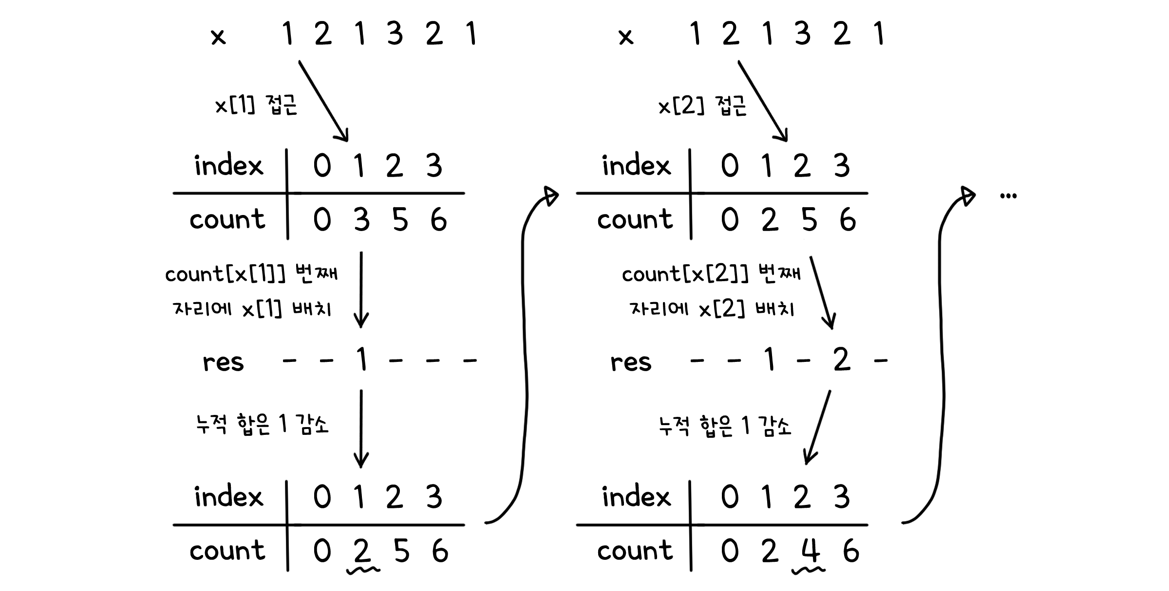 res[count[x[i]]] = x[i] # 누적합에 해당하는 자리에 삽입