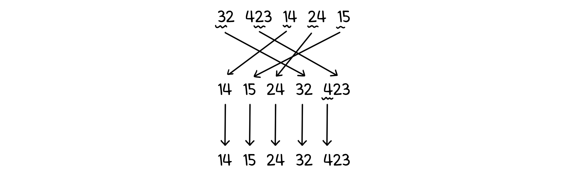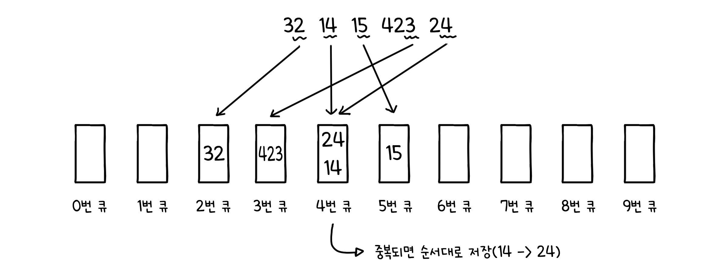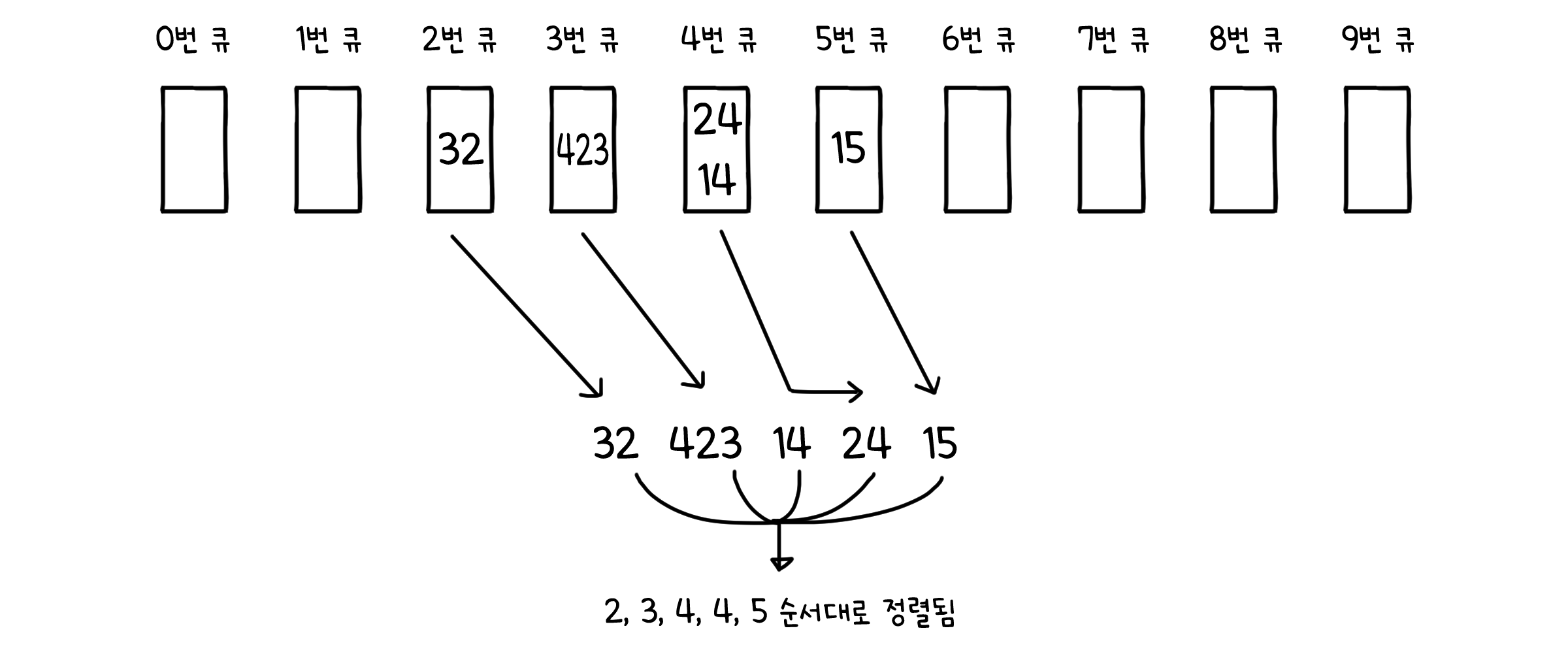 또 다른 예를 들어보겠습니다. 이번엔 [32, 14, 15, 423, 24]를 정렬해야 한다고 해봅시다. 우선 인덱스 접근을 위해 0 부터 9까지의 큐를 가지는 배열을 준비해둡니다. 그리고 배열을 순회하며 일의 자리 숫자에 해당하는 큐에 값을 저장합니다.