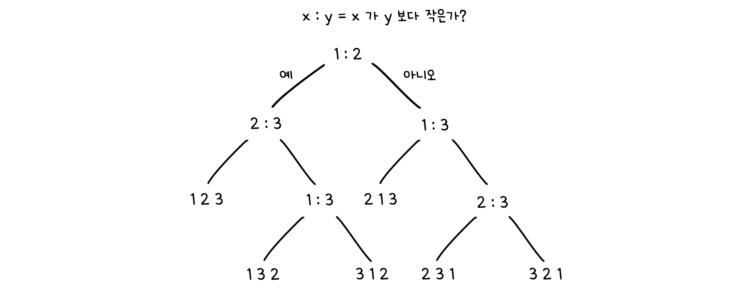 이때까지 여러가지 정렬 알고리즘에 대해 살펴보았는데, 볼 수 있듯이 모든 알고리즘은 평균 실행시간이 $O(n\log{n})$을 넘지 않습니다. 앞서 2장에서 문제의 복잡도에 대해 다루었던 것을 기억하나요? 모든 문제는 시간 복잡도의 하한선(Lower bound)이 존재하고, 정렬 문제의 경우 그 하한선이 $O(n\log{n})$이라는 것을 보였습니다. 그런데 이것은 의사 결정 트리를 계산 모델로 했을 때를 가정한 결과였습니다. 의사 결정 트리는 어떤 두 요소 a와 b가 있을 때 두 요소의 대소를 비교한 후 그 결과에 따라 순서를 배치하는 연산 방식이었습니다.