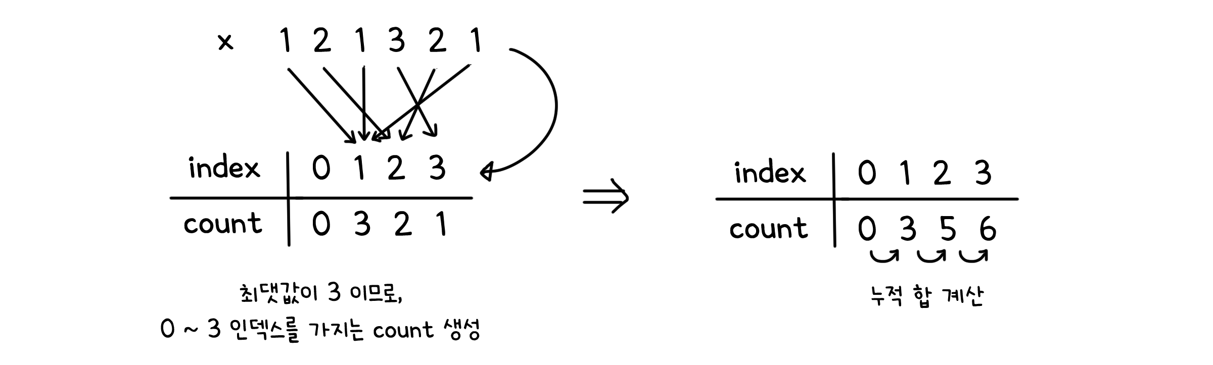 천천히 풀어서 설명해보겠습니다. [1, 2, 1, 3, 2, 1]이라는 배열을 정렬한다고 해봅시다. 우선 주어진 배열의 최댓값(여기서는 3)을 구하고, 0 ~ 3의 인덱스를 가지는 count 리스트를 만들어 각 숫자별 등장 횟수를 기록합니다. 그리고 각 요소 별로 누적합을 계산합니다. 이 값은 요소별로 재정렬되어야 할 위치를 표시할 것입니다.