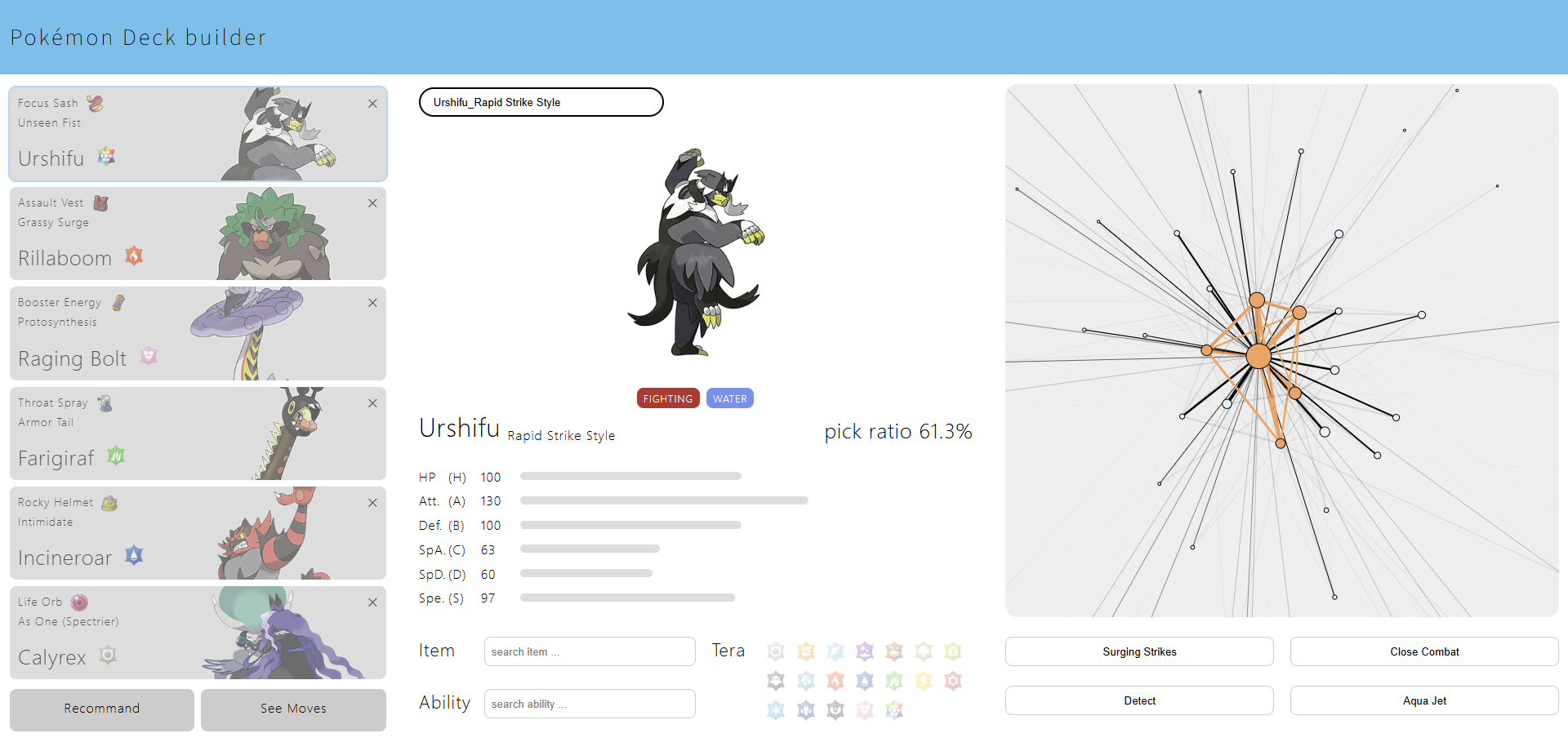 엔트리 데이터는 무게가 있는 그래프로 나타내어집니다. 하나의 점이 하나의 포켓몬을, 점사 점사이를 잇는 선은 두 포켓몬이 함께 채용되었음을 의미합니다. 점이 클수록 그 포켓몬의 채용률이 높은 것이고, 선이 굵을 수록 두 포켓몬이 함께 사용된 횟수가 많은 것이죠. 점을 클릭하면 어떤 포켓몬이 사용되었는지 그 정보와 함께 표시됩니다.