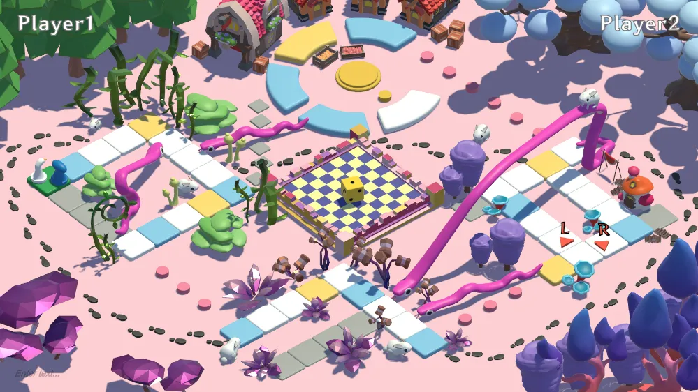 보드게임 맵과 UI는 이상한 나라의 앨리스 같인 상당히 whimsical한 테마를 잡고 디자인해보았습니다. 각 칸 마다 하나의 산출물을 넣고, 그와 관련 있을 만한 효과 & 이벤트들을 구현하였습니다.